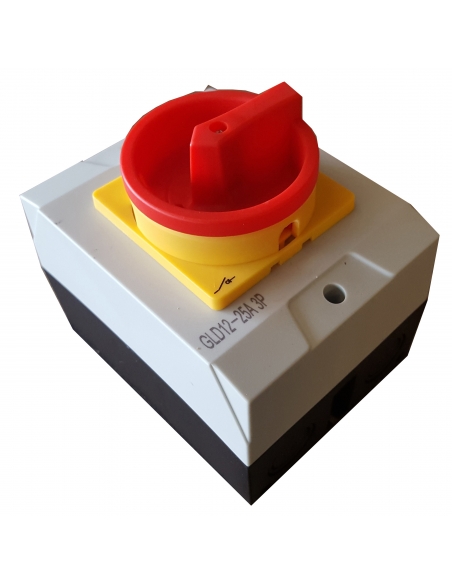 Caja con interruptor trifásico 25A. Mando amarillo-rojo. Interruptor rotatorio seccionador principal trifásico 25 A. montado en caja de policarbonato, con accionamiento amarillo-rojo bloqueable en posicion O. Grado de protección IP-65. Aptos para interrupción de circuitos eléctricos asi como arranque directo de motores...