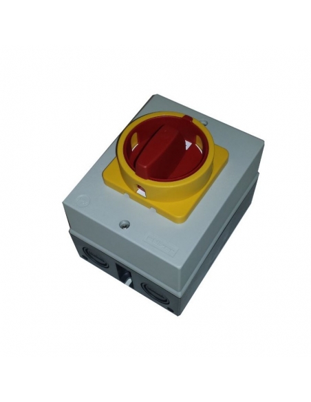 Interruptor rotativo seccionador principal trifásico 32 A. montado en caja de policarbonato, con accionamiento amarillo-rojo bloqueable en posicion O. Grado de protección IP-65. Aptos para interrupción de circuitos eléctricos asi como arranque directo de motores e interruptor principal en maquinas.